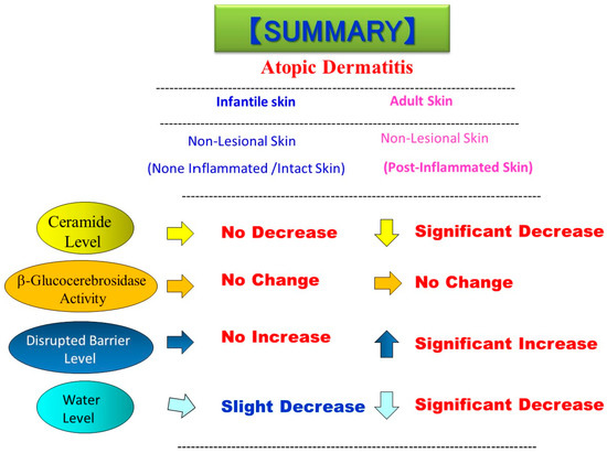 Comparison of the levels of ceramide, BGCase activity, barrier function, and water content between the nonlesional skin of infants and adults with AD [43].