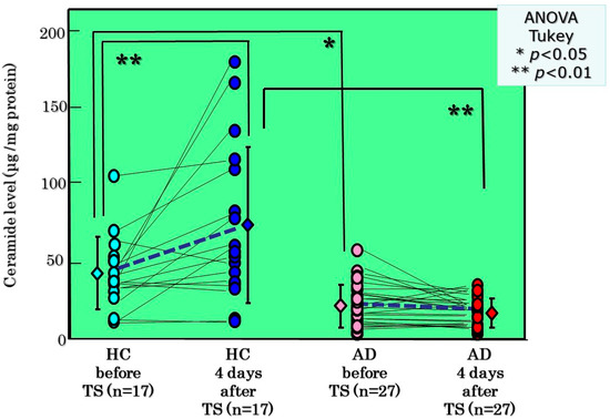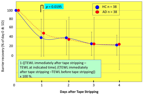 Thus, the evidence for the involvement of inflammation in the predisposition to a ceramide deficiency which results in impaired barrier and water reservoir functions prompted us to elucidate the effects of evoked inflammation on barrier/water function and ceramide biosynthesis in the SC of AD patients. We used tape-stripping to induce cutaneous acute inflammation and compared changes in the levels of barrier disruption and water content as well as of ceramides and sphingolipid enzyme activities between AD and HC skin during the barrier recovery process [21]. A similar approach with tape-stripping has been challenged in Nieman–Pick patients who have acid sphingomyelinase (aSMase) deficiency, which showed that the delayed barrier recovery is mainly ascribed to the inherently downregulated levels of aSMase activity due to mutation of the aSMase gene [48]. Based on this evidence, if the alteration of some ceramide-metabolic enzymes or related enzymes are involved as causative factors in the continued barrier disruption of AD skin, this challenge would provide a deep insight into phenotypic changes of barrier function and ceramide content in the SC of AD patients in response to cutaneous inflammation as well as into unknown factors that may be provoked following acute inflammation. Our results showed that basal levels of capacitance values prior to the tape-stripping are significantly lower in AD skin than in HC skin. During the tape-stripping process, the water content (capacitance value) increased with increased numbers of tape-strippings to a lower extent in AD skin than in HC skin. During the recovery process, at 4 days post-stripping, capacitance values in AD skin returned to almost the same values as before the tape-stripping. In contrast, capacitance values in HC skin returned to less than the pre-tape-stripping level. The skin capacitance values then returned to similar levels between AD and HC skin at 4 days post-stripping. On the other hand, basal levels of TEWL values prior to tape-stripping were significantly higher in AD skin than in HC skin. During the tape-stripping process, TEWL values increased with increasing numbers of tape-strippings to a similar extent in AD skin and in HC skin. During the recovery process, at 4 days post-stripping, TEWL values both in AD skin and in HC skin returned to higher levels than before the tape-stripping, the level of which was significantly higher in AD skin than in HC skin. The recovery of TEWL values after tape-stripping occurred at a significantly slower rate at 1 day post-tape-stripping in AD skin than in HC skin, but proceeded at a similar rate at 2, 3 and 4 days post-tape-stripping (Figure 5). Since a similar recovery rate was observed in Niemann–Pick disease caused by aSMase deficiency with a delay of barrier recovery only at 1 day post-tape-stripping [48], these tape-stripping studies on AD skin strongly suggest that the impaired homeostasis of a ceramide-generating process occurs in AD skin.