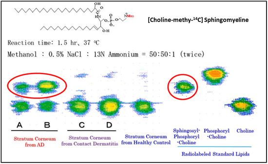 While there is no abnormality in the activity or the expression of ceramide-generating enzymes, including aSMase and BGCase, in AD skin [17,21,49,50], we analyzed SM hydrolysis in detail using radio-thin layer chromatography (RTLC) with [choline-methyl-14C]SM. RTLC analysis for the first time revealed that radiolabeled SPC was enzymatically released following incubation with the SC lysate from AD skin but not from contact dermatitis skin or HC skin (Figure 7) [54]. There are three possible ways by which radiolabeled materials could be released enzymatically from [choline-methyl-14C]SM, as shown in Figure 8: (1) the formation of [14C]PC by SMase; (2) the formation of [14C]sphingosylphosphorylcholine (SPC) by a deacylase-like enzyme; (3) the formation of [14C]choline by a phospholipase D-like enzyme.