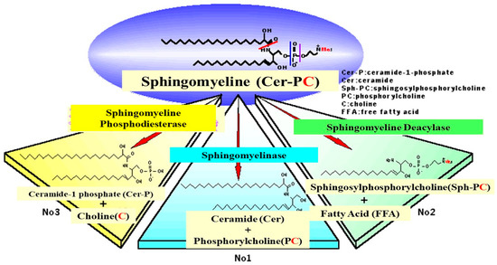 As depicted in Figure 22, which shows the relationships between enzyme defects and the accumulation of enzymic reaction products, a similar accumulation of SPC has been observed in Niemann–Pick disease [63]. Niemann–Pick disease is associated with defects in aSMase, which results in the lipidosis for SM [48], although no data has suggested that this accumulation of SPC is linked to the expression of an SM deacylase-like enzyme. Since SPC accumulation has been speculated to result from a defect of aSMase (because SPC is a substrate for aSMase) [48], it would be intriguing to determine whether there is a similar upregulated expression of SM deacylase in Niemann–Pick disease that could provide a mechanism for the production of SPC in that disease as it does for AD [50,55].