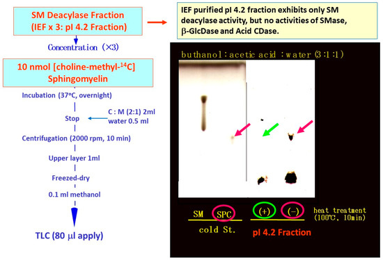 The observed release of radiolabeled SPC from [choline-methyl-14C]SM strongly suggested that the presence of a deacylase-like enzyme (SM deacylase) in the SC of AD skin. Therefore, as depicted in Figure 9, we thought it likely that the high expression level of SM deacylase competes with the ceramide-generating enzyme aSMase for the same substrate SM, which results in the decreased levels of ceramides seen in the SC of AD patients. Another study using RTLC analysis (Figure 10) demonstrated that similarly radiolabeled SPC is released from [choline-methyl-14C]SM following incubation with a SM deacylase-rich fraction (measured using [fatty acid-14C]SM as a substrate), which was partially purified from lysates of the SC of AD skin by analytical isoelectric focusing (IEF) chromatography (Figure 11) [55]. As the SM deacylase-rich fraction isolated by preparative IEF chromatography did not have any activities of aCDase, aSMase or BGCase (Figure 11) [55], these findings strongly indicated that SM deacylase enzymes exist in the SC of AD skin that are distinct from aCDase or other enzymes.