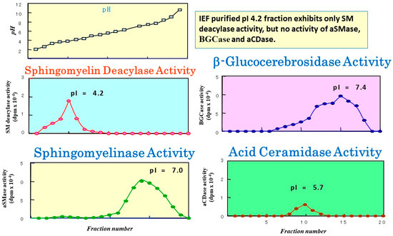 Analytical IEF chromatography using the atopic SC for SM deacylase, aSMase, BGCase, and aCDase and corresponding pI values [55].