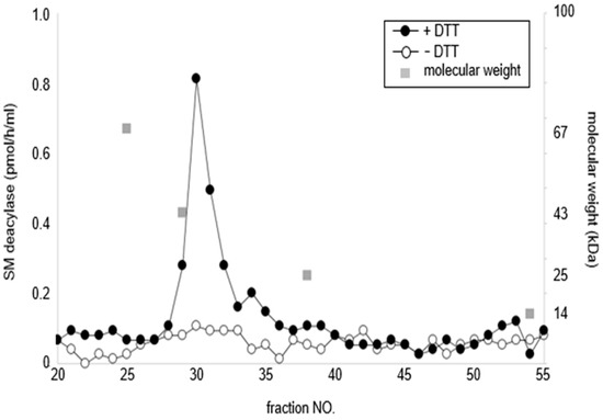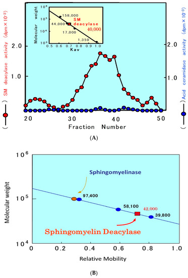 Gel chromatographic pattern of SM deacylase activity in the SC of AD skin (A) and the estimation of the apparent molecular mass of SM deacylase (B) [55].