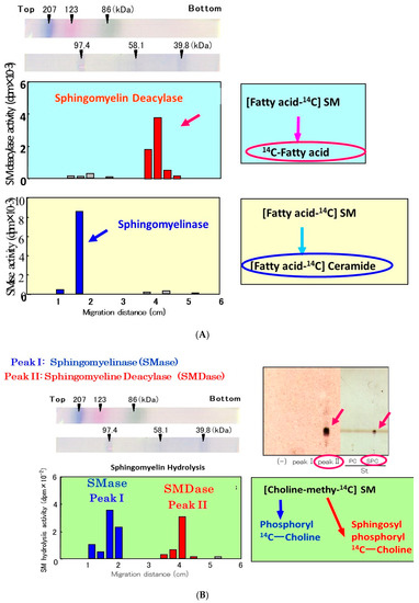 In a further study [55] to characterize the properties of SM deacylase, its activity showed a pH dependency with a peak at pH 5.0. As shown in Figure 10, analytical IEF chromatography demonstrated that the pI values of SM deacylase, aSMase, BGCase, and aCDase are 4.2, 7.0, 7.4, and 5.7, respectively. Enzymatic assays with N-[palmitoyl-1-14C]SM as a substrate following gel chromatography revealed that the activity of gel-fractionated SM deacylase, detectable by the release of 14C-free fatty acid, migrates with a molecular weight of ≈40,000, while aSMase, detectable by the release of 14C-ceramide, migrates at a molecular weight of ≈100,000 (Figure 12) [55]. Figure 12 shows preparative SDS-PAGE of epidermal extracts from AD patients. The gel was sliced into 20 pieces, homogenized and subjected to measurements for SM hydrolysis. In the assay for SM hydrolysis with N-[palmitoyl-1-14C]SM (Figure 13A) or [choline-methyl-14C]SM (Figure 13B) there were two separated peaks of radioactivity distributed in the lipophilic or aqueous phases, respectively, each corresponding in electrophoretic mobility to the molecular weights estimated for SM deacylase and aSMase. Furthermore, RTLC analysis of reaction products generated by fraction peak II demonstrated that the enzyme possesses activity that can release radiolabeled SPC (Figure 12B).