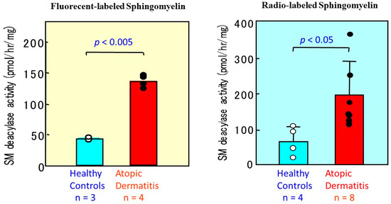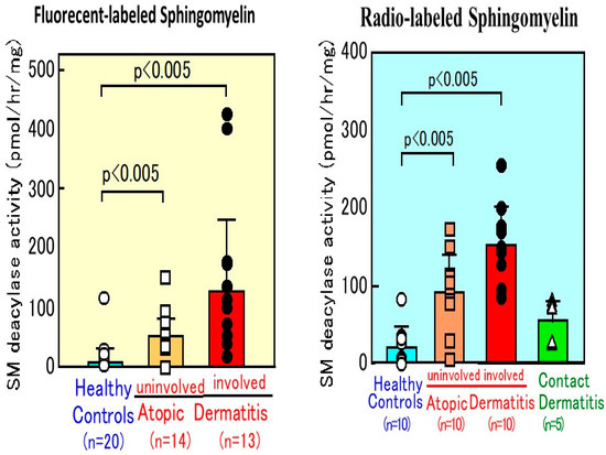 The activity of SM deacylase measured using fluorescent SM or radiolabeled [palmitoyl 14C]SM as a substrate in the lesional epidermis of AD skin [50].