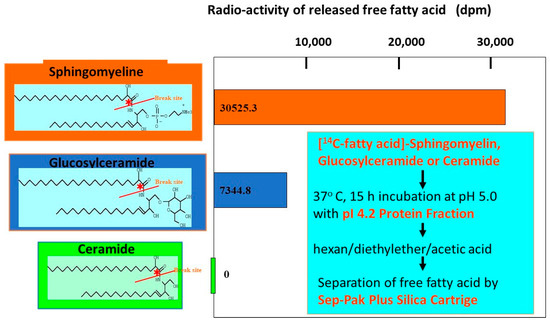 Our related study [62] using specific inhibitors of glucosyltransferase and BGCase, suggested that acylceramides are eventually generated through the deglycosylation of acylGCer by BGCase. In our biochemical study using [14C-palmitic acid]GCer, we found that the pI 4.2 IEF fraction, which contains partially purified SM deacylase, with no contaminating aCDase, BGCase or aSMase, can hydrolyze [palmitic acid-14C]GCer, but not N-[palmitoyl-1-14C]Cer at its acyl site to yield 14C-free fatty acid (Figure 16 and Figure 17) [55].