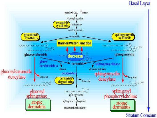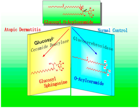 - Higuchi, K.; Hara, J.; Okamoto, R.; Kawashima, M.; Imokawa, G. The skin of atopic dermatitis patients contains a novel enzyme, glucosylceramide sphingomyelin deacylase, which cleaves the N-acyl linkage of sphingomyelin and glucosylceramide. Biochem. J. 2000, 350, 747–756. [Google Scholar] [CrossRef]