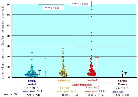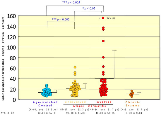 Quantitative analysis of SPC in the SC of AD skin revealed that there was a significant increase in the content of ng SPC/mg SC in nonlesional and in lesional SC compared with age-matched HCs (Figure 20) [20]. In contrast, there was no increase in SPC content in the lesional SC of patients with chronic eczema, which suggests that the upregulation of SPC in AD skin does not result from ordinary inflammation, but is associated with the altered lipid metabolism characteristic of AD.