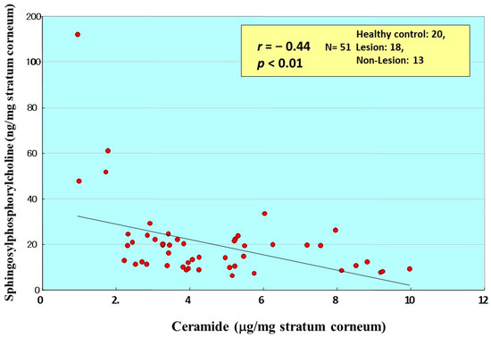 Comparison between the ceramide and SPC levels in the same individuals demonstrated that there is a weak inverse relationship between levels of ceramides and SPC that accumulate in the SC (Figure 21) [20]. In contrast, comparison with sphingosine (SS), which is a degradative product from ceramide produced by aCDase, demonstrated that there is no correlation (n = 32, r = −0.182, p = 0.319) between levels of SPC and SS in the overall group as well as in the individual groups [20]. In the groups used for correlation analysis there were significant decreases in the amounts of SS in the nonlesional and lesional SC from patients with AD compared to HC skin.