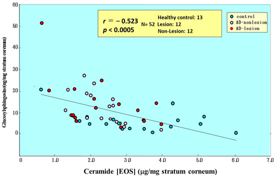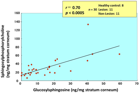 Comparison of the amounts of total ceramides and ceramide-1 with GSP in the same individuals demonstrated that there is a weak inverse relationship (n = 36, r = −0.416, p < 0.05 for total ceramides and n = 52, r = −0.5243, p < 0.001 for Cer[EOS]) between levels of ceramides and GSP that accumulate in the SC (Figure 24) [17]. In comparison with SPC, there was a significant positive correlation between levels of GSP and SPC (Figure 25).