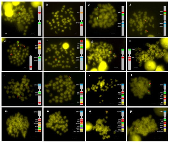 Double FISH-BAC of chromosome 2 (a–f) and chromosome 4 (g–p). (a) 38N10 (green)/46C5 (red), (b) 38N10 (green)/21O23 (red), (c) 4D15 (green)/46C5 (red), (d) 36I3 (green)/46C5 (red), (e) 38N10 (green)/9E8 (red), (f) 36I3 (green)/52G10 (red), (g) 12N15 (green)/46B2 (red), (h) 12N15 (green)/30J4 (red), (i) 46B2 (green)/36J2 (red), (j) 8A23 (green)/36H3 (red), (k) 12D24 (green)/8A23 (red), (l) 46B2 (green)/8A23 (red), (m) 46P22 (green)/36H2 (red), (n) 8A23 (green)/30J4 (red), (o) 12D24 (green)/30J4 (red), and (p) 46B2 (green)/12D24 (red). Bar = 2 μm (referred to large metacentric chromosome 1).