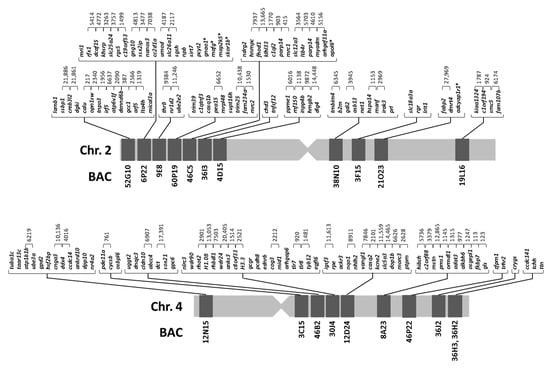 A total of 21 BACs with 154 genes were annotated (Table 1). The relative position of these BACs in each chromosome was obtained by double FISH-BAC (Figure 1). The integrated maps were generated from analysis of cytogenetic, BAC sequencing and micro-synteny data (Figure 2). These maps were used to study synteny as described below. For metacentric chromosome 2, 7 out of 11 BACs (52G10, 6P22, 9E8, 60P19, 46C5, 36I3, and 4D15) were positioned in arm 1 (in a telomere to centromere direction, 66 genes annotated). The other 4 BACs (38N10, 3F15, 21O23 and 19L16) were placed in arm 2 (in a centromere to telomere direction, 19 genes annotated). For the submetacentric chromosome 4, only 1 out of 10 BACs was positioned in the “p” arm (BAC12N15, 12 genes annotated), and the rest (3C15, 46B2, 30J4, 12D24, 8A23, 46P22, 36J2, 36H3, and 36H2) were situated in the “q” arm (in a centromere to telomere direction, 57 genes annotated).