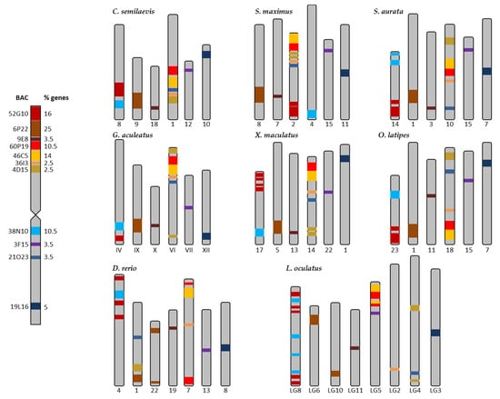 Distribution of the BACs of the metacentric chromosome 2 of Solea senegalensis in the chromosomes of the eight reference fish species: Cynoglossus semilaevis, Scophthalmus maximus, Sparus aurata, Gasterosteus aculeatus, Xiphophorus maculatus, Oryzias latipes, Danio rerio, and Lepisosteus oculatus. The colors represent the different BACs. % of genes is referred to the number of genes in each BAC, respective to the total of the genes in chromosome 2 (85 genes).