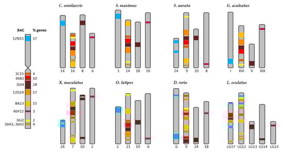 Distribution of the BACs of the submetacentric chromosome 4 of Solea senegalensis in the chromosomes of the eight reference fish species: Cynoglossus semilaevis, Scophthalmus maximus, Sparus aurata, Gasterosteus aculeatus, Xiphophorus maculatus, Oryzias latipes, Danio rerio, and Lepisosteus oculatus. The colors represent the different BACs in the chromosome 4. % of genes is referred to the number of genes in each BAC, in respect to the total of the genes in chromosome 4 (69 genes).