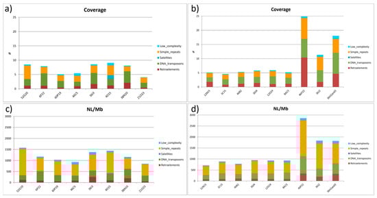 Summary of repeat types present in the BACs located in chromosomes 2 (a), (c), and 4 (b), (d) of Solea senegalensis. Coverage is measured as the percentage of repeat elements per BAC length. NL/Mb is the number of loci per Mb of BAC sequenced.