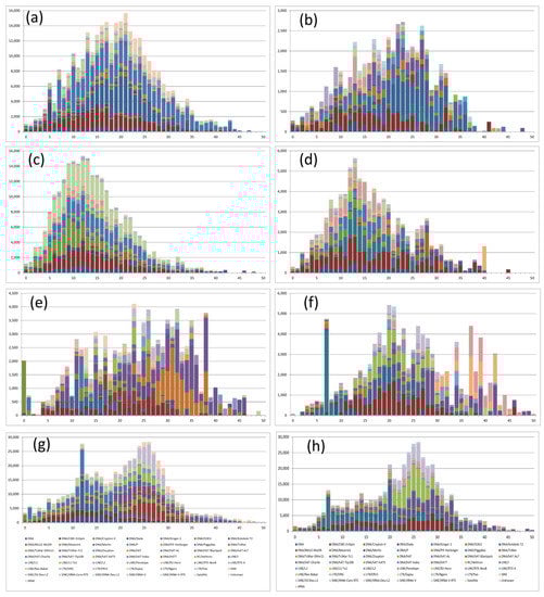 Kimura distance-based copy divergence analysis of transposable elements of chromosomes 2 and 4 of Solea senegalensis compared with their syntenic regions in other reference fish species. Graphs represent genome coverage (y axis) for each type of TE in the different genomes analyzed, clustered according to Kimura distances to their corresponding consensus sequence (x axis, K-value from 0 to 50). Graphs (a,c,e,g) show results from chromosome 2; and graphs (b,d,f,h) from chromosome 4. Rows are: Cynoglossus semilaevis (a,b), Scophthalmus maximus (c,d), Oryzias latipes (e,f) and Danio rerio (g,h).