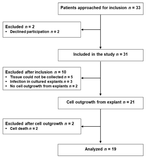 Thirty-three eligible patients scheduled for laparoscopic sigmoid resection (SR) or low anterior resection (LAR) were approached for participation the day before their operations from 2 October 2017 to 18 January 2018, and 31 patients were included after providing their written consent. Tissue samples from 10 patients were excluded for various reasons as indicated in Figure 1. From the remaining 21 patients, fibroblasts were isolated from the proximal and distal tissue rings, representing the colon and rectum, respectively, procured during surgery; successful outgrowth was achieved in explants from 19 patients, as shown in Figure 1. Three of the 31 included patients and one of the 19 analyzed patients developed AL within the 1-month observation period.