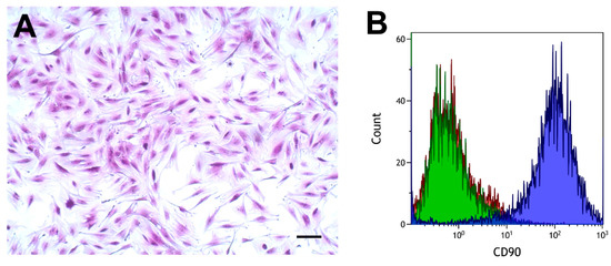 Cells were grown in a T75-flask to 80% confluence, trypsinized, suspended in PBS, and counted. Cells (3 × 105) were incubated with a (1) FITC-conjugated mouse monoclonal anti-human CD90 (Thy-1) antibody (AS02 clone; Dianova, Hamburg, Germany) diluted 1:50 in PBS [44,45], (2) FITC-conjugated mouse IgG1 isotype control (GM4992; Thermo Fisher Scientific) diluted 1:5 in PBS, or (3) PBS alone for 45 min at 4 °C in the dark. Cells were washed twice with PBS (300× g for 5 min), resuspended in PBS, and added to microtiter plates for flow cytometry analysis (Cell Lab Quanta SC MPL, Beckman Coulter, Brea, CA, USA). Data were analyzed using Kaluza software (Beckman Coulter).