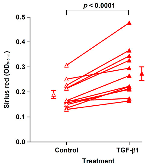 The effect of TGF-β1 was examined in fibroblast strains isolated from the last 12 analyzed patients. TGF-β1 treatment for 8 days of CoReFs increased collagen deposition, as shown in Figure 4.