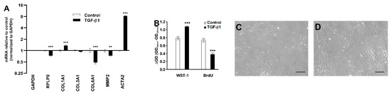 To elucidate the mode of action of TGF-β1, we measured levels of key genes by RT-qPCR. TGF-β1 treatment increased COL1A1 (1.4-fold) and ACTA2 (8.3-fold) mRNA levels, while the normalized COL6A1 and MMP2 mRNA levels decreased in response to TGF-β1 treatment, as shown in Figure 6A. TGF-β1 treatment also increased the formation of formazan from cleaved water-soluble tetrazolium salt (WST-1) as a proxy for cell numbers but decreased BrdU incorporation, reflecting DNA synthesis in the CoReFs, as shown in Figure 6B. No apparent differences in morphologic features were found on examination by phase contrast microscopy, as shown in Figure 6C,D.