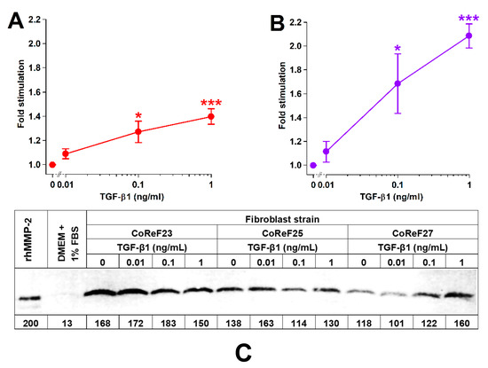 Effect of TGF-β1 on collagen deposition (A), cell numbers (B), and MMP-2 (C) of CoReFs treated for 8 days at three different concentrations (0 [control], 0.01, 0.1 and 1 ng/mL). (A,B) Mean ± SEM (n = 6). * p < 0.05, *** p < 0.001 vs. control. (C) A representative zymogram (inverse image) of MMP-2 in the conditioned media (5 µL/lane) from CoReFs (3 patients). The estimated MMP-2 content (pg) is indicated below each lane of the zymogram from the densitometric determination of band intensities by ImageJ.