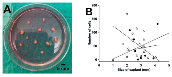 Proximal and distal tissue rings were collected during the laparoscopic surgical procedure [35]. Macroscopically healthy tissue rings were washed in ice-cold sterile Hank’s balanced salt solution containing 1.25 mM Ca2+, 0.80 mM Mg2+, 5.6 mM glucose, and antibiotics-antimycotics (100 U/mL penicillin, 100 μg/mL streptomycin, and 0.25 μg/mL amphotericin B). The mucosa was scraped off with a knife, including the lamina propria with subepithelial myofibroblasts [62], and the external muscularis externa was macrodissected away. The remaining tissue representing primarily the submucosa was cut into small pieces (1–4 mm). Tissue explants were placed on a tissue culture dish (Cellstar®, Greiner Bio-One, Frickenhausen, Germany), air-dried for 20 min, and incubated in 5 mL of complete culture medium (Dulbecco’s modified Eagle medium with high glucose [25 mM], sodium pyruvate, and GlutaMAX™ [DMEM, Gibco] supplemented with 10% fetal bovine serum [FBS, F7524] and the antibiotic-antimycotic mixture) in a humidified atmosphere of 5% CO2/air at 37 °C, as shown in Figure 9A. Medium was changed twice weekly. We found that outgrowth over the first 6 days was independent of explant size in the range from 2 to 4 mm, as shown in Figure 9B. After 25–29 days, the outgrown cells (no epithelium was observed) were detached by trypsinization and incubated in 5 mL complete culture medium in T25 tissue culture flasks (Nunc, Roskilde, Denmark).