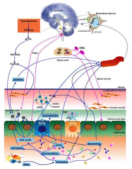 Main symptoms observed in IBD patients originate from the altered sensory, motor, and secretory intestinal functions, resulting in abdominal pain, diarrhea, gastrointestinal bleeding, and malnutrition [6]. Two principal phases are recognized in the development of the intestinal damage: a transitory acute phase characterized by prominent epithelial injury, altered secretion, and enhanced visceral sensitivity, which is followed by long-term changes involving the neuromuscular layer, with persistent alteration of the motor function [7,8]. This latter response involves structural and functional changes within the enteric nervous system (ENS) as a result of the interplay taking place between enteric neurons and different cellular populations of the gut microenvironment, infiltrating immunocytes and the saprophytic microflora [7,8,9]. The enteric microbiota is considered a fundamental player in the development of IBD, influencing both the acute phase and the more latent inflammation-induced neuronal dysfunction. Indeed, the correlation between gut dysbiosis, i.e., changes in intestinal microbial composition, and IBD etiopathogenesis has been consistently shown both in preclinical and clinical studies [4,10]. In addition to intestinal symptoms, IBD patients present with extra-intestinal stress-related disorders, such as major depression and generalized anxiety, which influence the outcome of disease treatment reducing the chance of remission [11,12,13,14,15]. IBD patients suffering from psychiatric disorders are at higher risk of requiring surgery and of incurring functional gut disorders [16]. The Manitoba IBD cohort study reports that persons with IBD display significantly higher lifetime prevalence of both depression and some anxiety disorders with respect to a matched community sample without the disease [17]. Pediatric IBD patients, presenting with neuropsychiatric symptoms often associated with mild behavioral and cognitive disturbances, particularly verbal memory loss, typically develop a more severe disease state and poor quality of life as compared to patients without these comorbidities [18,19,20]. The exact mechanism/s underlying the association between the severity of IBD and psychiatric disorders have not been unveiled yet, although there are hints suggesting that they may relate to alterations of the saprophytic microflora composition and function, resulting in changes along the so-called “microbiota–gut–brain” [11,21,22]. The majority of studies carried out to delineate the role of gut–brain interactions in the context of gastrointestinal diseases have focused on functional disorders, such as irritable bowel syndrome (IBS) [23]. However, the correlation between IBD and dysregulated gut–brain communication is now acknowledged [24]. This bidirectional communication axis allows signals originating within the central nervous system (CNS) to control gut motor, sensory, secretory, and immune functions. Conversely, messages from the gastrointestinal tract may be conveyed to brain regions, where these signals may influence high functions such as behavior, cognition and emotion regulation, both in normal and disease states [25,26,27]. The gut microbiota is a fundamental player in gut–brain communication by releasing a plethora of metabolites, which are involved in the control of local metabolic, neuronal, and immune functions and extend their actions to more distal regions within the CNS, being critical for brain development and homeostasis [25,26,27]. In this context, changes within the symbiotic interplay between the host and the saprophytic microflora during IBD may bear important consequences for the host health, underlying not only development of gastrointestinal symptoms but also favoring the patient psychophysiological vulnerability [22,24,28]. This review encompasses a novel and comprehensive overview of the more recent evidences suggesting that alterations in the microbiota–gut–brain bidirectional communication pathways may concur to IBD pathogenesis, sustaining the development of both local and CNS symptoms. In this context, we will consider the relevance of the main microbial-derived metabolites, also defined as “postbiotics”, such as bile acids, short-chain fatty acids, and tryptophan metabolites in the development of IBD-associated gut and brain dysfunctions. The last section covers a critical evaluation of the main available clinical evidence pointing to the manipulation of the saprophytic gut microflora as a possible adjuvant approach for the treatment of IBD-related gastrointestinal and neuropsychiatric symptoms.