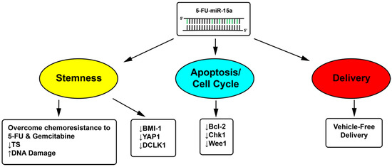 - Fesler, A.; Liu, H.; Ju, J. Modified miR-15a has therapeutic potential for improving treatment of advanced stage colorectal cancer through inhibition of BCL2, BMI1, YAP1 and DCLK1. Oncotarget 2018, 9, 2367–2383. [Google Scholar] [CrossRef]