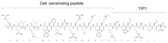 We designed TLR-inhibitory peptide 1 (TIP1; Peptron Inc., Daejeon, Korea) by deriving the chemical structure from the Toll/interleukin 1 receptor (TIR) domain of myeloid differentiation primary response gene 88 (MyD88) adaptor-like (MAL). The molecular nature of TIP1 enables binding to the TIR domain of TLRs, thereby hindering the assembly of TLRs with their corresponding adaptor proteins and resulting in inhibition of TLR-mediated downstream signaling. For the effective delivery of TIP1 to the required site of action, we conjugated TIP1 to a cell-penetrating peptide (CPP), making a peptide of 24 amino acids with a formula weight of 3168 g/mol (Figure 1). Previously, we demonstrated that CPP-linked TIP1 (hereafter referred to as TIP1) blocked signal transduction of multiple TLRs, with the strongest effect on TLR4 []. In addition, this biological action was shown to lead to attenuated tissue damage in animal models of sepsis and inflammatory arthritis.
