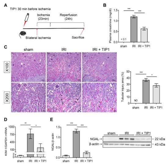 Eight-week-old male C57BL/6 mice weighing 20–23 g (Dae Han Bio Link Co., Ltd., Chungcheongbuk-Do, Korea) were randomly divided into three groups: (1) sham: control mice in which only a flank incision was performed (2) IRI: the mice underwent bilateral renal pedicle clamping after vehicle injection, and (3) IRI-TIP1: the mice underwent bilateral renal ischemia after the administration of an intraperitoneal TIP1 administration. Briefly, 30 min after an intraperitoneal injection of TIP1 (10 nmol/g) or 0.9% normal saline, the mice were anesthetized using Rompun (10 mg/kg; Bayer, Leuverkusen, Germany) and Zoletil (30 mg/kg; Virbac Laboratories, Carros, France). The kidney pedicles were then exposed on both sides through a bilateral flank incision and clipped for 23 min using microaneurysm clamps []. Mice were placed on a heating pad at 38–39 °C in a supine position to maintain body temperature during the surgical procedure. Mice were euthanized after 24 h of reperfusion with intraperitoneal injection of Rompun and Zoletil; blood was collected, and kidneys were harvested. Plasma creatinine levels were determined using the VetTest 8008 (IDEXX Laboratories, Westbrook, ME, USA). All animal experiments were performed in compliance with the guidelines of the Animal Research Ethics Committee of Kyung Hee University and approved by the Institutional Animal Care and Use Committee of Kyung Hee University Hospital at Gangdong (KHNMC AP 2019–002; approval date: 22 February 2019).