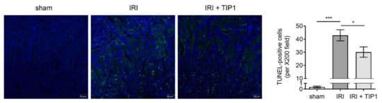 Renal IRI was induced by 23-min renal pedicle clamping after intraperitoneal vehicle or TIP1 injection (Figure 2A). The mice subjected to IRI showed an increase in plasma creatinine levels compared with that in the sham mice; however, TIP1 treatment before ischemic injury reduced the elevated creatinine concentration (Figure 2B). After 24 h of reperfusion, IRI caused widespread tubular cell necrosis and tubular dilation, predominantly involving the deep cortex and corticomedullary junction. This tubular damage was less extensive in mice pretreated with TIP1 (Figure 2C). Consistent with these findings, levels of neutrophil gelatinase-associated lipocalin (NGAL) protein and kidney injury molecule-1 (KIM-1) mRNA increased to a much lesser extent in TIP1-treated mice than those in untreated mice (Figure 2D,E). Terminal deoxynucleotidyl transferase-mediated deoxyuridine triphosphate nick-end labeling (TUNEL) staining also showed that TIP1 pretreatment significantly reduced the number of apoptotic cells induced by IRI (Figure 3).