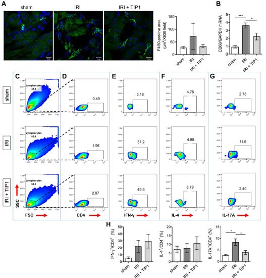 Inhibitory effect of TIP1 on immune cells following kidney ischemia-reperfusion injury. (A) Immunofluorescence staining and quantification of F4/80+ macrophages in the kidneys. Kidneys from sham (n = 4), IRI (n = 6), and IRI-TIP1 (n = 6) groups were harvested 24 h after IRI. Nuclei were counterstained with DAPI (blue). Scale bar = 10 μm. (B) CD68 mRNA expression in kidney tissue from sham (n = 6), IRI (n = 6), and IRI-TIP1 (n = 6) groups. The intrarenal lymphocyte (C) and CD4+ cell populations (D) at 24 h after IRI. The intrarenal IFN-γ+/CD4+ (E), IL-4+/CD4+ (F), and IL-17A+/CD4+ (G) cell populations at 24 h after IRI. (H) The percentage of intrarenal IFN-γ+, IL-4+, and IL-17A+ cell populations among CD4+ T cells. Kidneys from sham (n = 4), IRI (n = 6), and IRI-TIP1 (n = 6) groups were harvested at 24 h after IRI. Data are pooled from two independent experiments and expressed as mean ± SEM. * p < 0.05, *** p < 0.001. TLR-inhibitory peptide 1 (TIP1); forward scatter (FSC); side scatter (SSC); interferon-gamma (IFN-γ); interleukin-4 (IL-4); interleukin-17A (IL-17A); 4′,6-diamidino-2-phenylindole (DAPI).