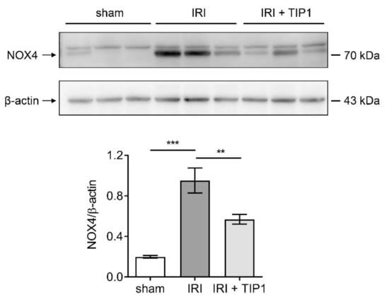IRI is associated with increased ROS production in damaged tissues. Western blot analysis revealed that TIP1 pretreatment substantially attenuated the renal expression of NADPH oxidase 4 (NOX4) induced by IRI (Figure 6), suggesting that the renoprotective effect of TIP1 is associated with the reduction in ROS.