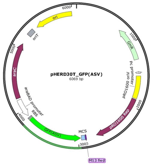 The recombinant pHERD30T_GFP(ASV) vector. The recombinant pHERD30T vector, encoding the GFP(ASV) protein was obtained by cloning the gfp(ASV) gene into the original vector using the In-Fusion HD Cloning Plus kit; the vector map was designed with the software SNAPGENE v. 4.2.6.