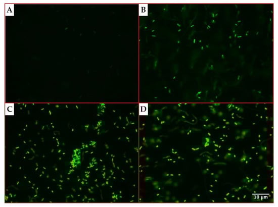 The microscopy assays evidenced an increasing fluorescence emission by P. aeruginosa cells over time, as shown in Figure 2.