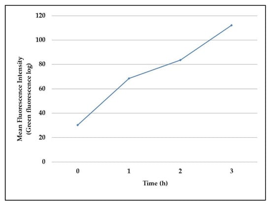 The observed data were then confirmed in flow cytometry assays, which reported the same increase of fluorescence intensity in the 3 h-experiment, as evidenced in Figure 3.