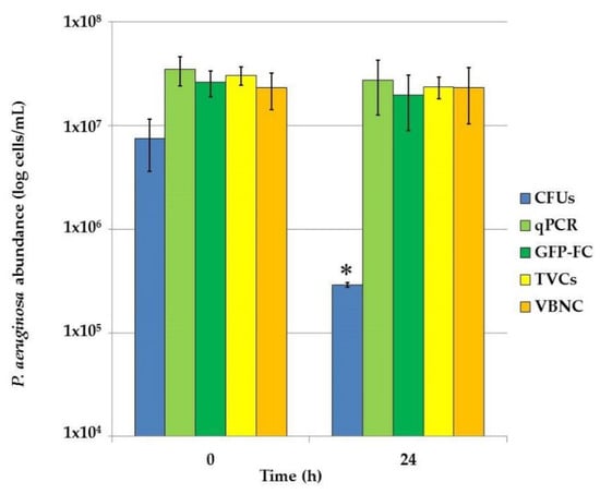 The VBNC portion of the total P. aeruginosa population was then calculated as the difference between TVCs and CFUs; only values ≥0.5 log were considered (Figure 6).