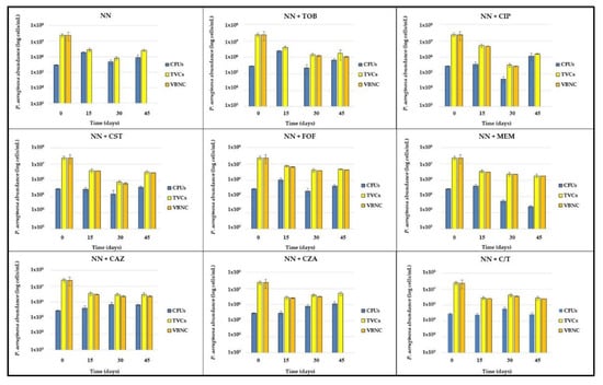 After exposure to 1000× MIC piperacillin (T0), biofilms were washed with phosphate buffered saline (PBS) and subcultured in Non-Nutrient (NN) broth, alone or supplemented with 1/4× MIC of each tested antibiotic. Biofilms were maintained in these conditions for 45 days, assessing the abundance of CFUs and TVCs cells every 15 days (T15, T30 and T45) (Figure 5).