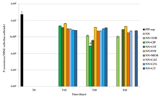 VBNC cells amount in P. aeruginosa biofilms exposed for 45 days to starvation and 1/4× MIC of eight different antibiotics/antibiotic combinations. After exposure to 1000× MIC piperacillin (PIP-exp, T0), P. aeruginosa biofilms were subcultured in Non-Nutrient (NN) broth, alone or supplemented with 1/4× MIC of tobramycin (TOB), ciprofloxacin (CIP), colistin (CST), fosfomycin (FOF), meropenem (MEM), ceftazidime (CAZ), ceftazidime/avibactam (CZA) or ceftolozane/tazobactam (C/T). The samples were maintained in these conditions for 45 days and assessed for the amount of VBNC cells every 15 days (T15, T30 and T45). The results are reported as average of three biological replicates ± standard deviation. *, p < 0.001.