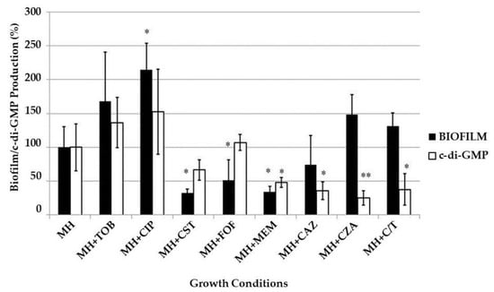 Biofilm development was significantly (p < 0.05) enhanced in the presence of subinhibitory concentrations of ciprofloxacin, tobramycin, ceftazidime/avibactam and ceftolozane/tazobactam; on the contrary, it was significantly (p < 0.05) repressed upon exposure to colistin, fosfomycin, meropenem and ceftazidime. The c-di-GMP production was increased only in presence of tobramycin and ciprofloxacin, while it was repressed when biofilms were grown with colistin or β-lactam antibiotics.