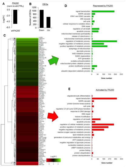 Deficiency of PA200 affects transcription of functionally relevant genes. (A) Analysis of RNA-Seq data confirmed depletion of PSME4 (gene name for PA200) mRNA in shPA200 knockdowns in SH-SY5Y cells. (B) Quantification of differential gene expression (DEGs) between shCTRL and shPA200 disclosed the subset of genes up- and down-regulated in PA200-silenced cells. (C) The heat map shows Log2FC of DEGs, which were clustered according to Euclidean distance measurements. The list on the right quotes every second gene. (D,E) The GO enrichment analysis for the genes activated and repressed after PA200 silencing.