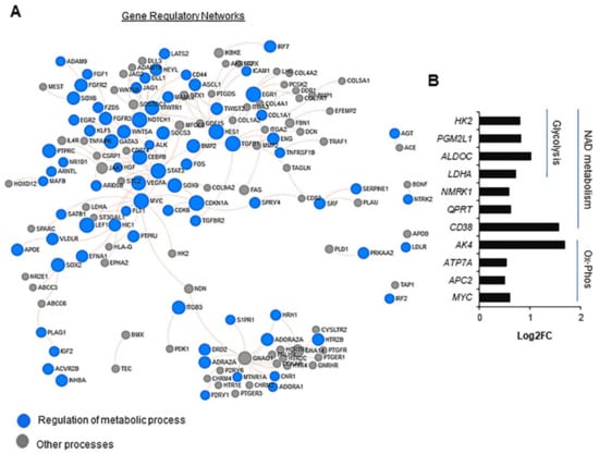 PA200 regulates the transcription of genes involved in cellular metabolism. (A) Examination of the minimal signaling network of genes transcriptionally affected by PA200 deficiency demonstrates the considerable representation of nodes, which are functionally linked to cellular metabolism. (B) PA200 silencing activated genes that contribute to NAD metabolism and mitochondria respiration. Differential gene expression is shown (shPA200 vs. shCTRL) derived from RNA-Seq data for NAD metabolic process (GO: 0019674), glycolytic process (GO: 0006096), and regulation of oxidative phosphorylation (GO: 0002082).