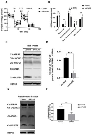 2.2. Mitochondrial Stress Assay Indicates Mitochondrial Dysfunction in shPA200 Cells