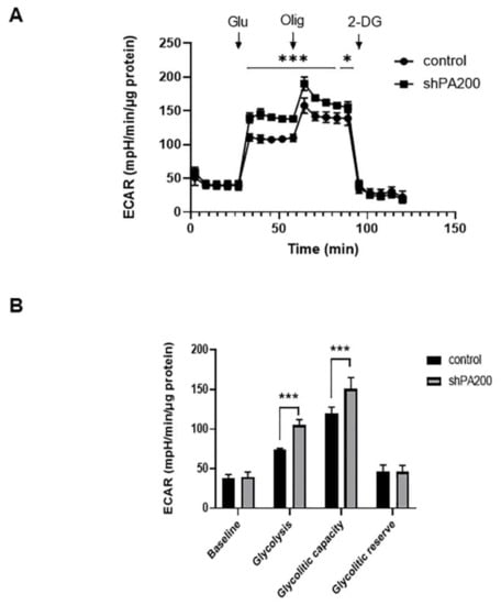 We next sought to determine if the metabolic stress response induced changes in glycolysis after PA200 depletion. For this purpose, we performed the glycolysis stress test in real time on intact shPA200 and control cells by measuring extracellular acidification rate (ECAR) using Seahorse XF analysis. We sequentially added glucose, oligomycin, and 2-deoxyglucose (2-DG) to our samples. Glucose was added to measure and calculate glycolysis under basal conditions, based on the differences in values of ECAR before and after glucose administration. Oligomycin administration was added to determine the glycolytic capacity of cells: oligomycin blocks oxidative phosphorylation and, thus, directs cells toward glycolysis to fulfill ATP demand. The glucose analog, 2-DG, inhibits glycolysis to determine baseline ECAR values. Interestingly, the glycolytic activity was significantly higher (42.186% increase) in shPA200 cells compared to control cells. Furthermore, energy production (glycolytic capacity), independent of mitochondrial respiration was also slightly (26.106%), yet significantly, higher, suggesting a metabolic shift from oxidative phosphorylation to glycolysis in cells depleted of PA200 (Figure 4A,B).