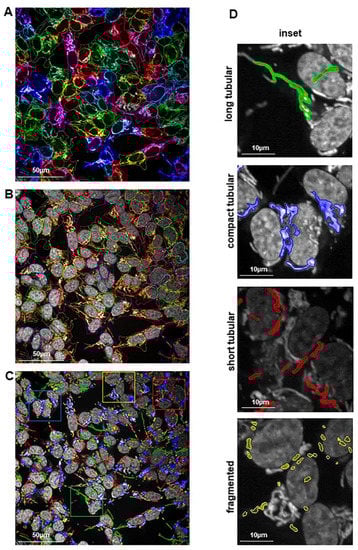 - Leonard, A.P.; Cameron, R.B.; Speiser, J.L.; Wolf, B.J.; Peterson, Y.K.; Schnellmann, R.G.; Beeson, C.C.; Rohrer, B. Quantitative analysis of mitochondrial morphology and membrane potential in living cells using high-content imaging, machine learning, and morphological binning. Biochim. Biophys. Acta 2015, 1853, 348–360. [Google Scholar] [CrossRef] [PubMed]