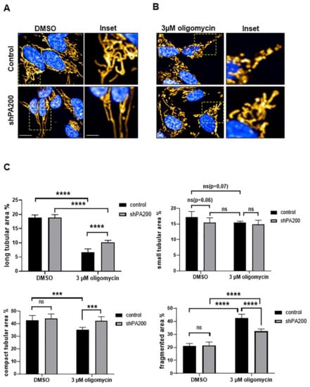 We observed no significant differences between vehicle-treated shPA200 and vehicle-treated control cells. In both cell lines, elongated mitochondrial morphology was maintained (Figure 6A,B).