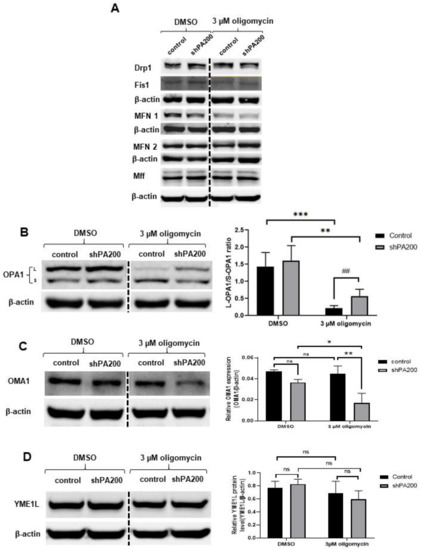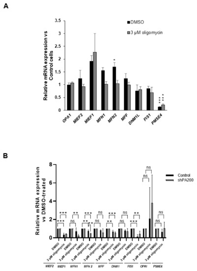 The mitochondrial fusion–fission process governs the maintenance of mitochondrial morphology [32,49,50,51]. We, therefore, analyzed the mRNA levels of the mitochondrial fusion protein genes, OPA1 (Opa1), MFN1 (Mitofusin-1), and MFN2 (Mitofusin-2), and the mitochondrial fission protein genes, MIEF1 (Mid51), MIEF2 (Mid49), FIS1 (Fis1), DNM1L (Drp1), and MFF (Mff), in control and shPA200 cells treated with vehicle (DMSO) and 3 µM oligomycin (Figure 7A). Figure 7A demonstrates gene-expression fold changes following 24 h treatment with vehicle and 3 μM oligomycin.