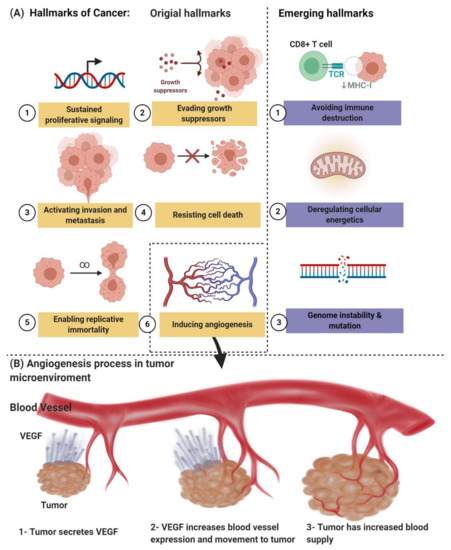 (A) The hallmarks of cancer include original hallmarks (sustained proliferative signaling, evading growth suppressors, activating invasion and metastasis, resisting cell death, enabling replicative immortality, and inducing angiogenesis) and emerging hallmarks (avoiding immune destruction and deregulating cellular energetics, genome instability, and mutation). (B) Angiogenesis process in tumor microenvironments. Created with BioRender.com.