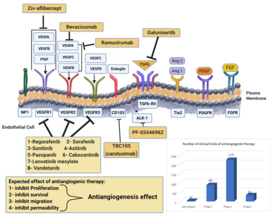 Drug targeting angiogenesis. VEGF-axis dependent and non-VEGF-mediated mechanisms of resistance to antiangiogenic therapies. Non-VEGF axis receptors: TGF-β receptor, Tie2, PDGFR, and FGFR. Antiangiogenic drugs mechanisms of action for anti-VEGF (monoclonal antibodies, RTK inhibitors) and novel targeted therapies are presented. Additionally, the chart represents the number of clinical trials of antiangiogenic therapy at all different phases. Data obtained from https://www.clinicaltrials.gov/ (accessed on 4 February 2021).