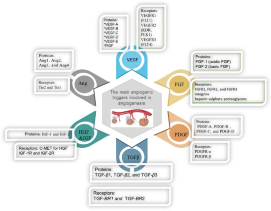 VEGF, which is overexpressed in many human cancers, is a predominant regulator of angiogenesis complex processes. As shown in Figure 2, the VEGF family has five members (VEGF-A, VEGF-B, VEGF-C, VEGF-D, and placental growth factor (PIGF)). These five ligands interact with three receptors (VEGFR-1, VEGFR-2, VEGFR-3). The interaction between VEGF-A and VEGFR-2 triggers endothelial cell migration and cell mitogenesis, leading to cancer development and metastasis. The interaction between VEGF-B and VEGFR-3 mainly maintains the newly formed blood vessels. However, VEGF-C and VEGF-D bind to VEGFR-3 and is primarily expressed in lymphatic vessels. Thus, VEGFR-3 and its ligands play a central role in lymph angiogenesis and the cancer cell spread to lymph nodes. PIGF is a cytokine that plays multiple roles in angiogenesis, including fueling tumor growth through the activation of stromal cells, myeloid cells, and bone marrow-derived endothelial progenitors. Neuropilin 1 (NRP1), neuropilin 2 (NRP-2), and heparan sulfate proteoglycans are identified as VEGF coreceptors. In addition, other cell surface receptors, like growth factor receptors and integrins, can crosstalk with VEGF. Moreover, the activity of VEGFR-2 can be induced by NRP-1 and NRP-2; however, these neuropilins can also signal independently.